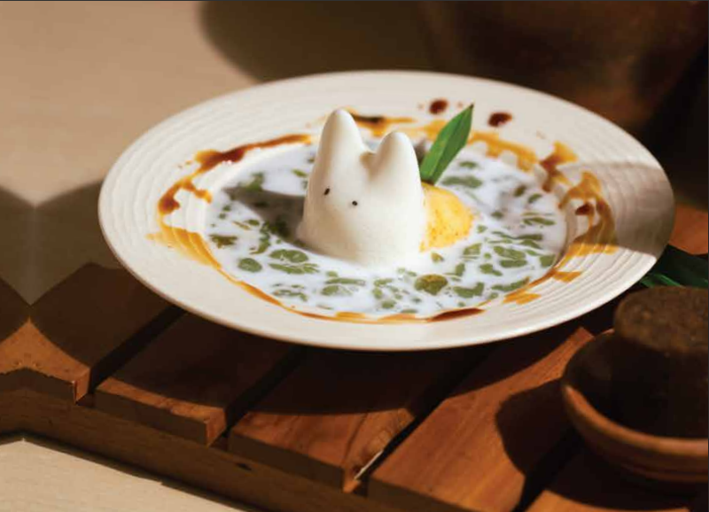 Puding jeli dan dawet dipadukan dengan susu dan gula aren, menghadirkan rasa manis lembut.